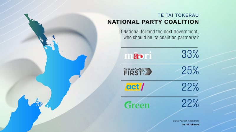 If National were to form the next government, 33% saw Te Pāti Māori as the most popular coalition partner, 25% favoured NZ First and 22% chose the Greens.