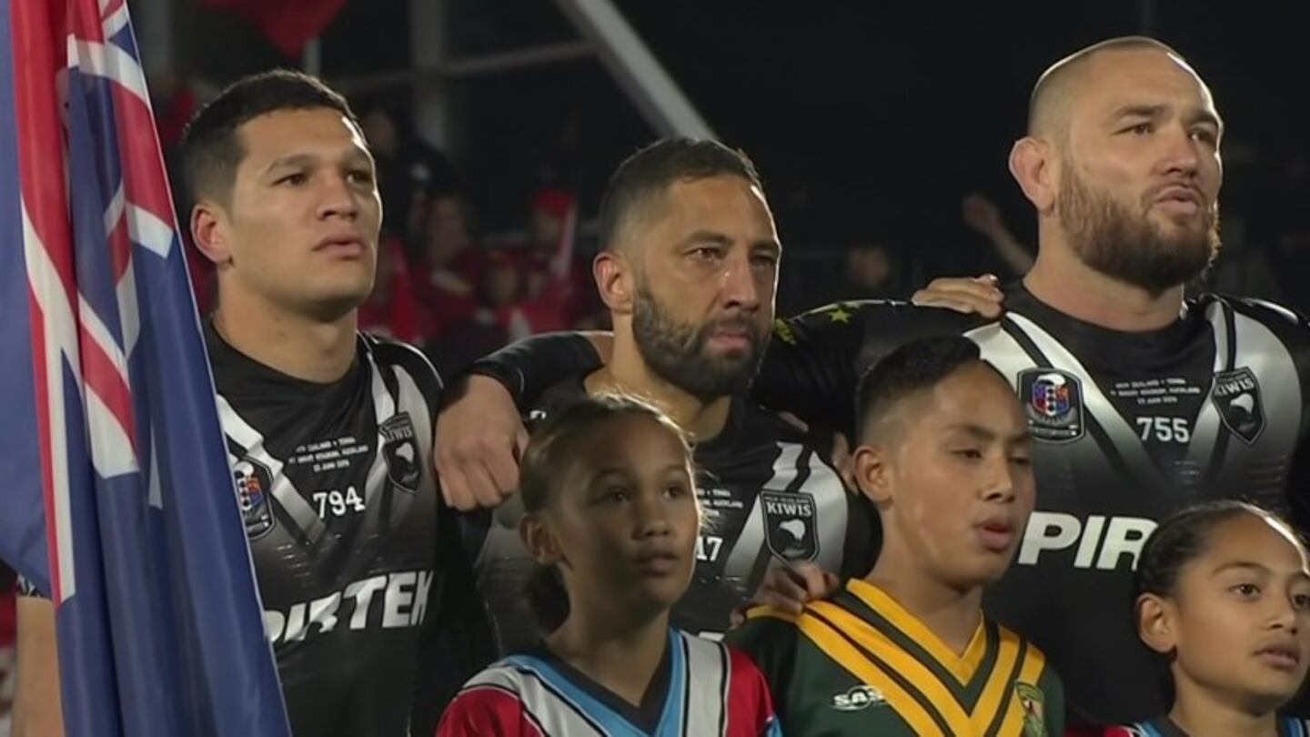 Benji Marshall lets his emotions show during the national anthem. Photo/SkyTV.