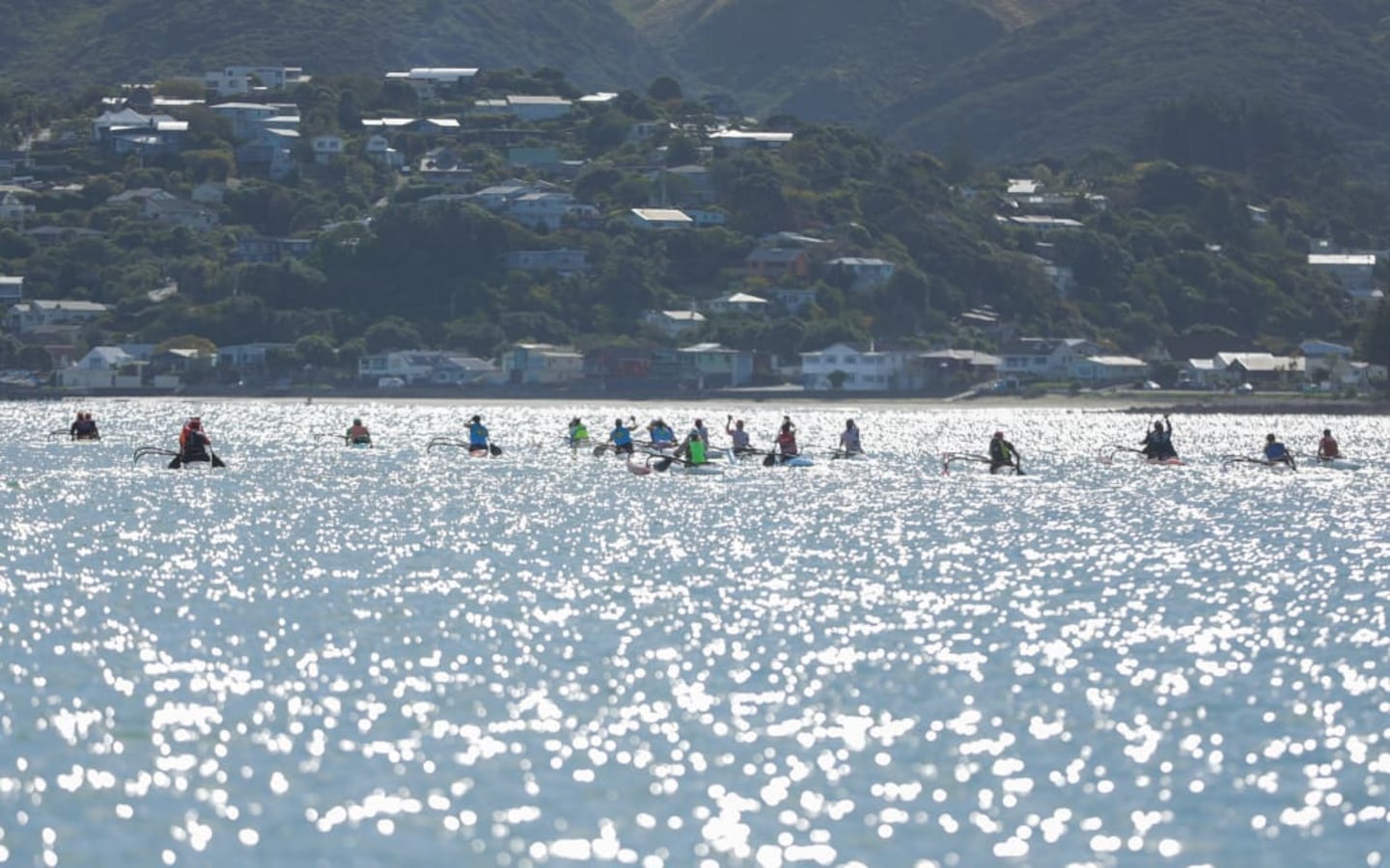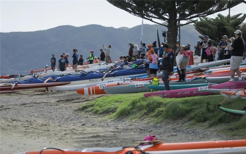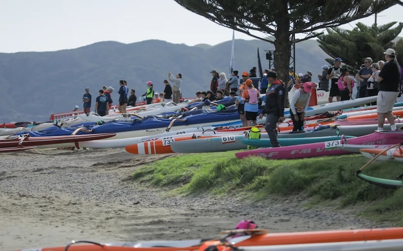 Hundreds of spectators are scattered across the shore of the Ngāti Toa Domain to catch a glimpse of the paddlers in the harbour.