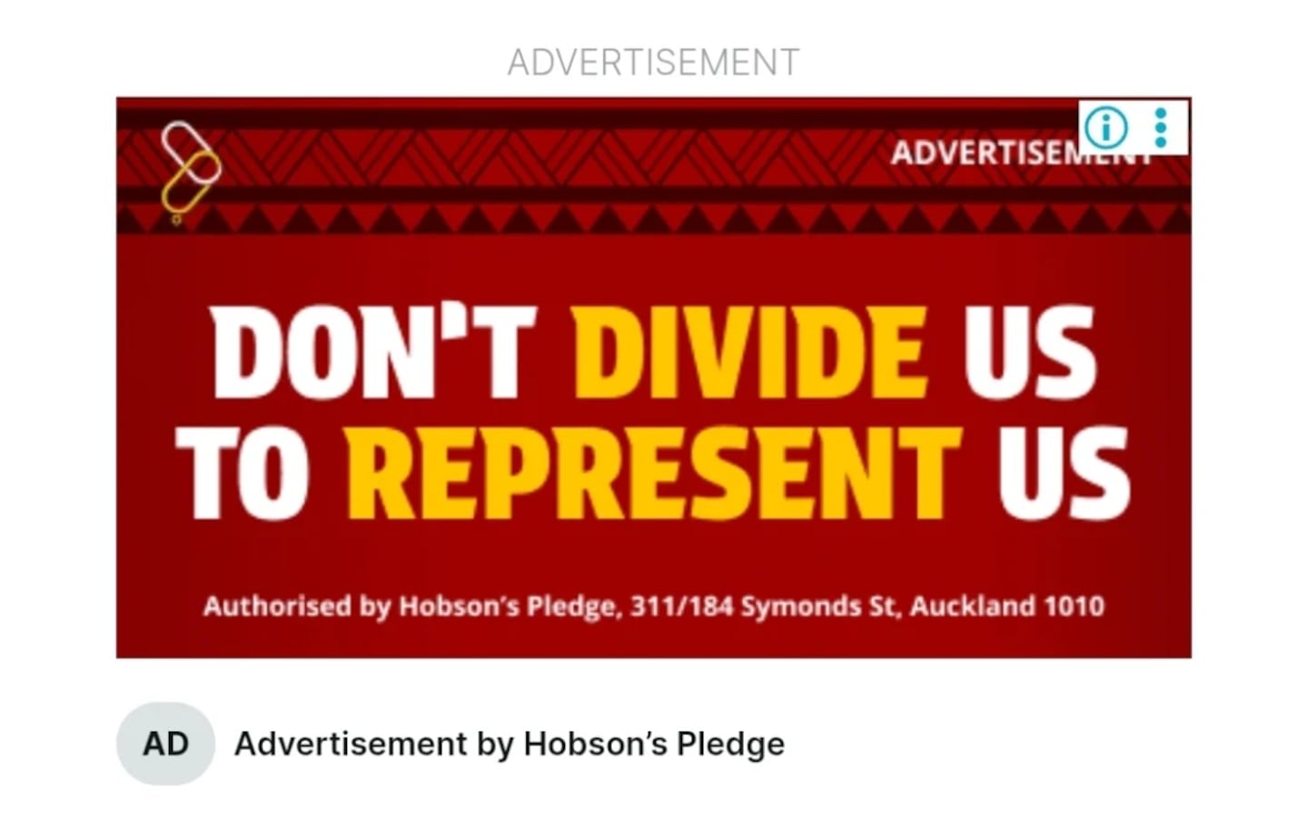 The Hobson’s Pledge ad says “Don’t divide us to represent us. Vote no to Māori Wards” and links to a website that shows pictures of mayors and councillors who have openly expressed that they stand for Māori wards and are against the use of their photo by the outfit.