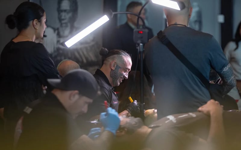 Te Āti Awa leader Kura Moeahu was one of the people going under the needle on Wednesday, both he and his wife were receiving touch-ups to their moko.