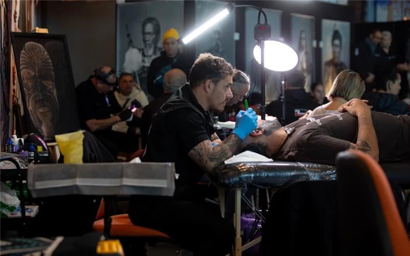 Te Āti Awa leader Kura Moeahu was one of the people going under the needle on Wednesday, both he and his wife were receiving touch-ups to their moko.