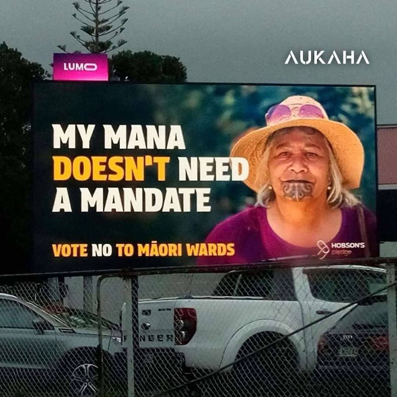 One of the most contentious moments in Hobson’s Pledge’s campaign came when the group used a photograph of Ellen Tamati - a kuia bearing a moko kauae - on billboards that read, “My mana doesn’t need a mandate. Vote no to Māori wards.”
