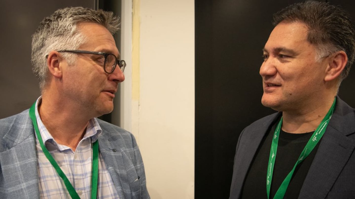 Beca's energy director Nick Cozens chats with Iwi Leaders Forum chair Jamie Tuuta at the National Māori Energy Summit. (Te Korimako o Taranaki)