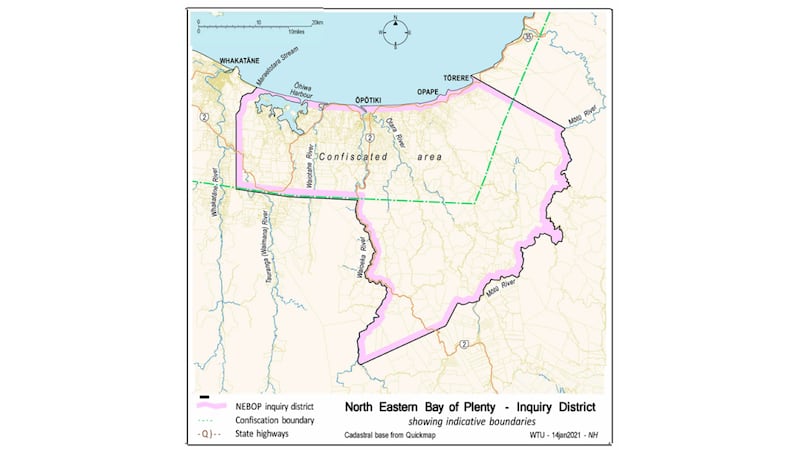 The district is defined by the boundaries of neighbouring inquiries: Tūranganui-a-Kiwa (Wai 814) to the east and Te Urewera (Wai 894) to the south and includes areas such as Ōhiwa Harbour and surrounding communities.