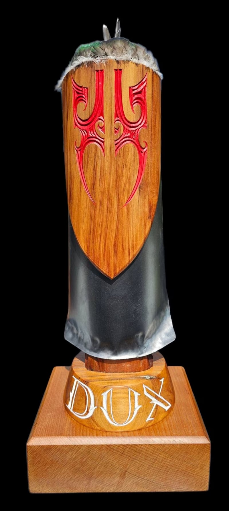 At the school’s prizegiving, Grant explained the different parts of the trophy, saying it had a rimu base, and the representation of Papakura is carved from tōtara.
